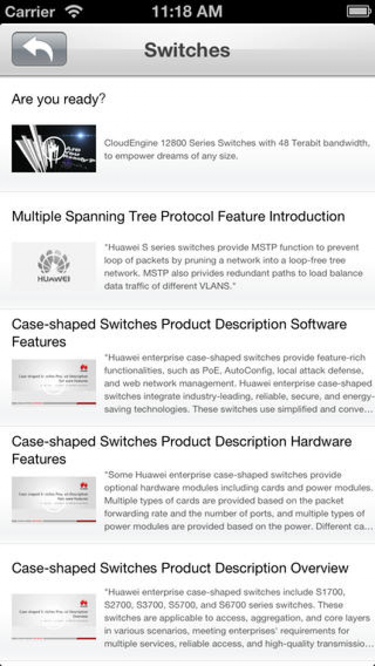 Это приложение позволит вам просматривать и скачивать описание и техническую документацию продукции Huawei на ваше мобильное устройство. Вы сможете получать доступ к обзорам, характеристикам, функциям и спецификациям всех устройств Huawei, включая маршрутизаторы, коммутаторы, беспроводные продукты, а так же продукты доступа и сетевого управления. Приложение позволяет сохранять нужные вам материалы в формате PDF для прочтения в режиме оффлайн.