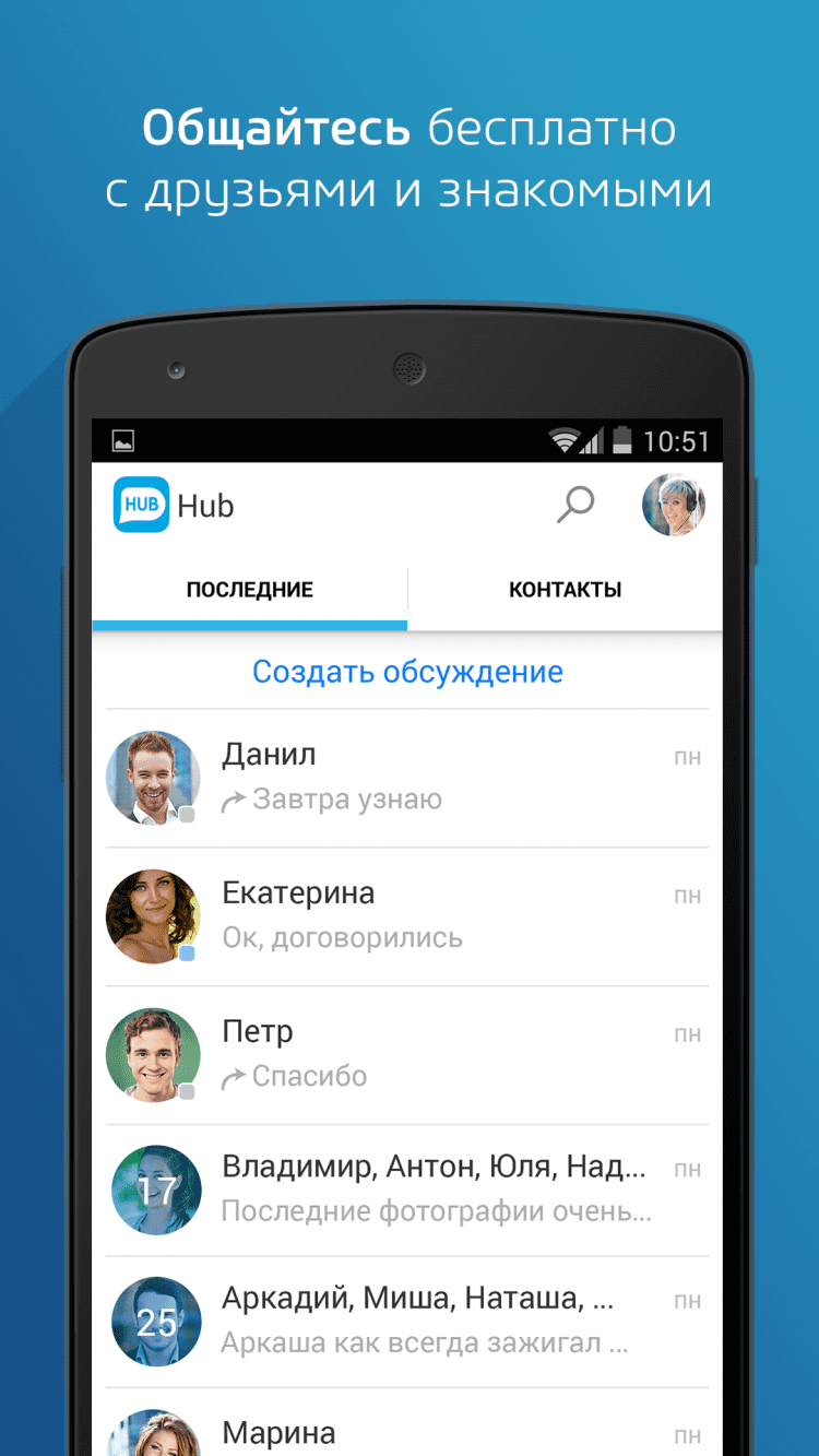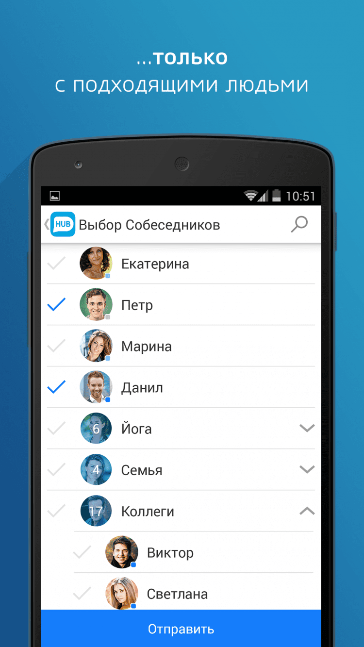 Hub Программа для обмена сообщениями только с подходящими людьми. Выбирайте собеседников по одному или группами, отправляйте им текстовые сообщения или свои новости из Facebook или ВКонтакте. Приятной особенностью программы является возможность выбора друзей, которым будет доступен просмотр ваших фотографий. Войти в программу Hub можно при помощи своего аккаунта Фотостраны.