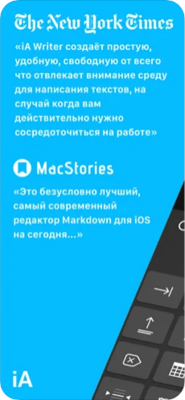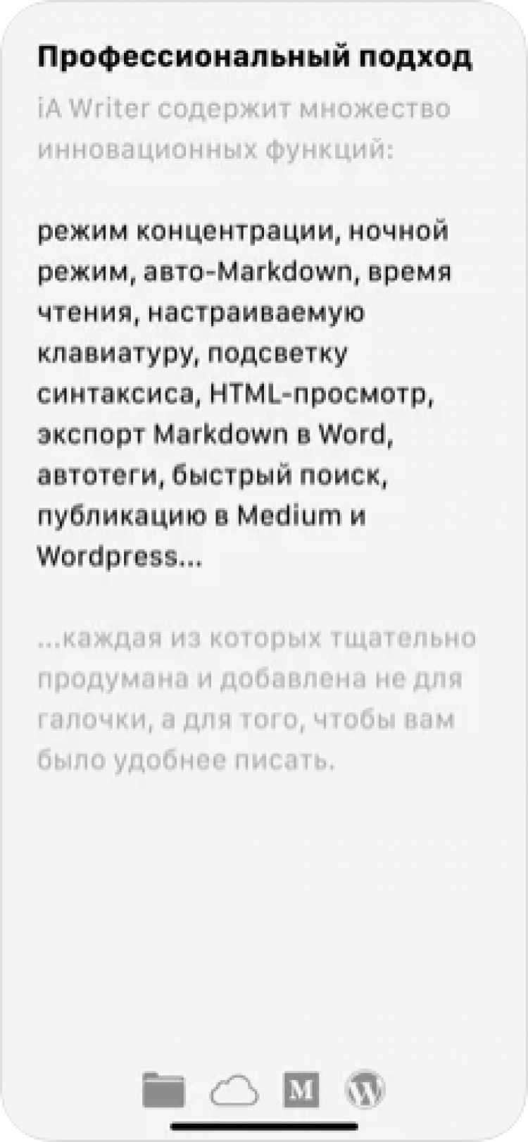 iA Writer — это приложение предоставляет вам доступ к спокойному и удобному пространству для работы с текстовыми файлами, написания писем и т.д. Избавит вас от отвлекающих элементов, но предложит ряд полезных инструментов для максимального удобства при работе с текстами.
