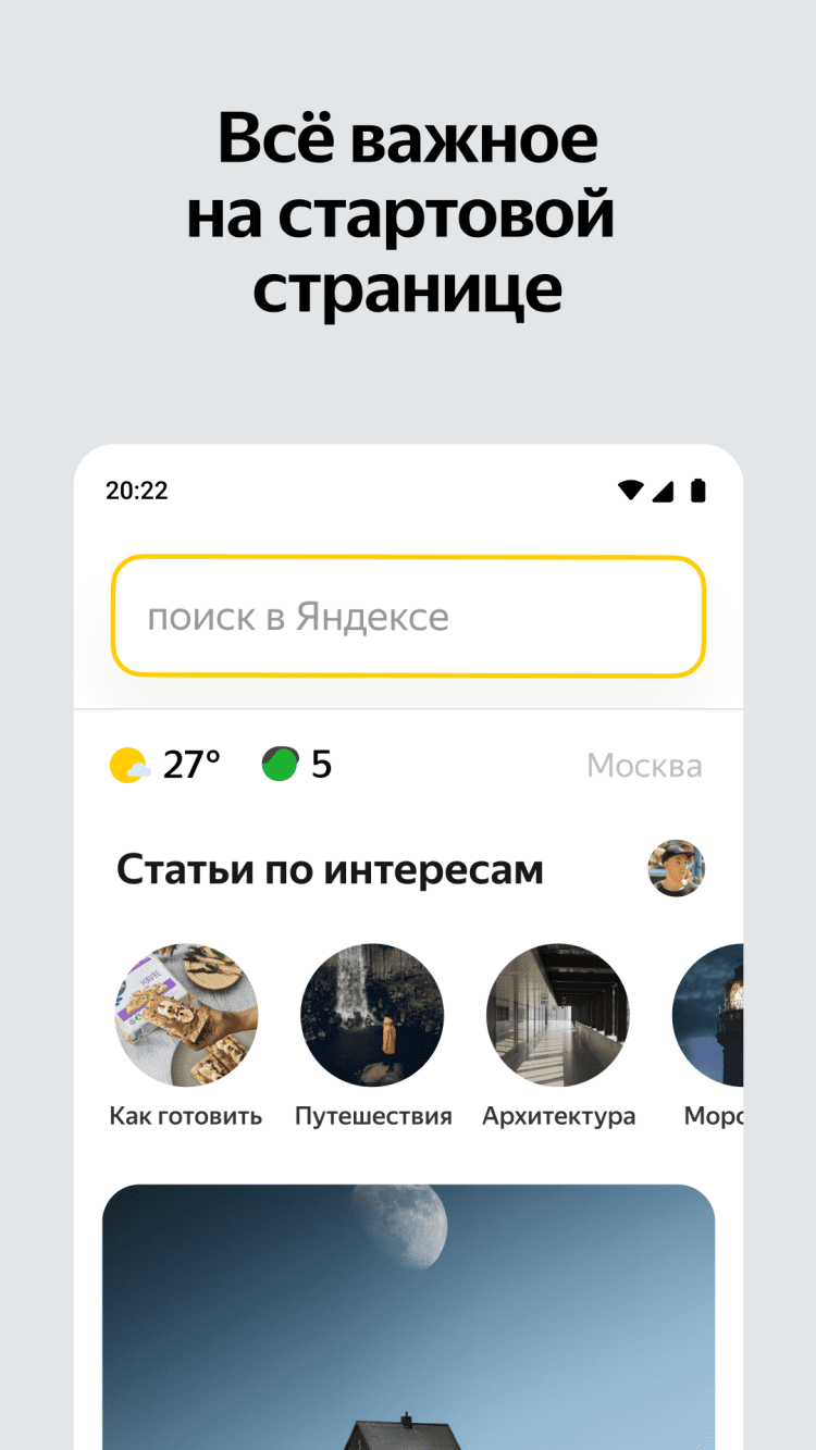 Яндекс Старт — это официальное бесплатное приложение компании Яндекс для веб-серфинга с широкими функциональными возможностями для ОС Андроид. Позволяет получать быстрый доступ к любой информации в Интернете, такой как актуальные новости, курсы валют, погода и многое другое.