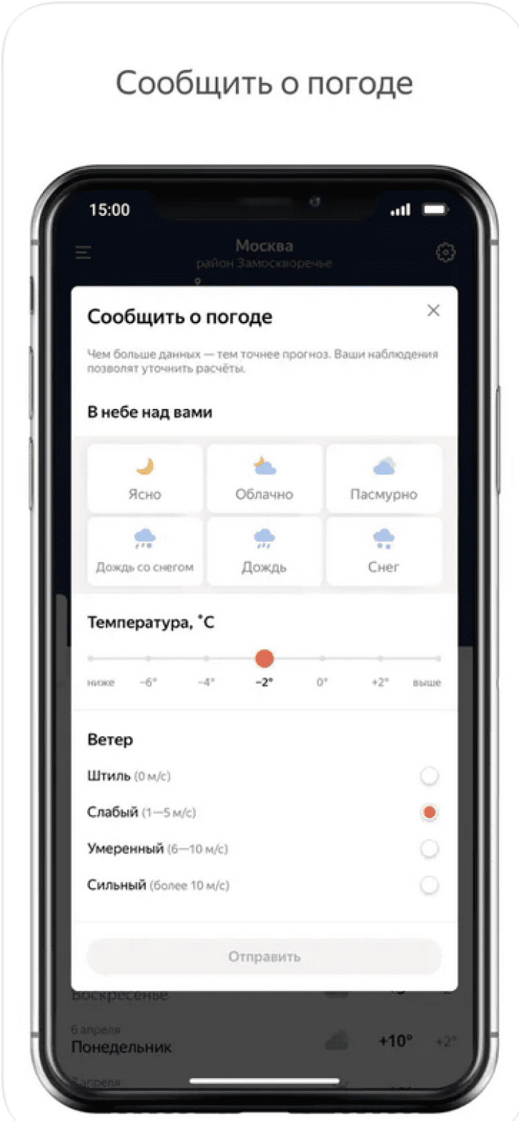 Также, вы сможете повлиять на точность отображаемых прогнозов. Сообщите Яндексу о погоде и собранные данные будут использованы для уточнения прогноза.