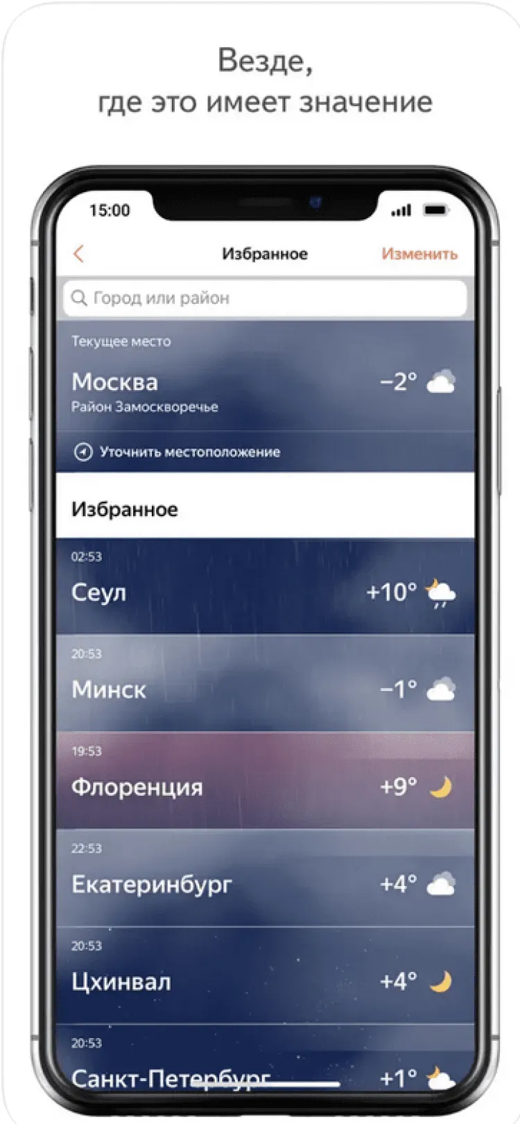 Яндекс.Погода — это приложение, при помощи которого вы сможете в любой момент оставаться в курсе грядущих изменений погодных условий в вашем городе или любой точке мира.
