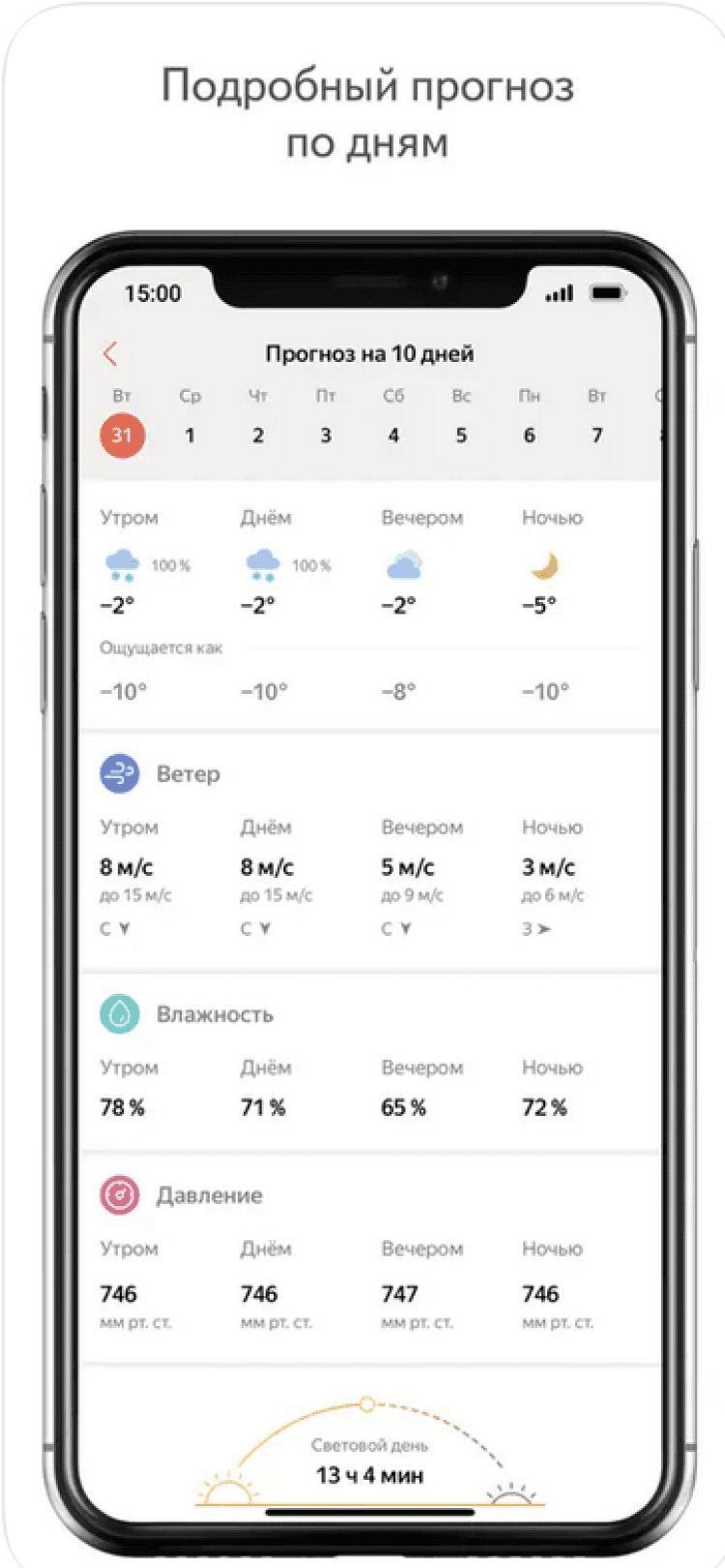 Приложение Яндекс.Погода — онлайн-прогноз позволит вам узнать данные о температуре воздуха, скорости и направлении ветра, атмосферном давлении, уровне влажности, а так же времени восхода и захода солнца как для вашего города, так и для любого выбранного вами населенного пункта.