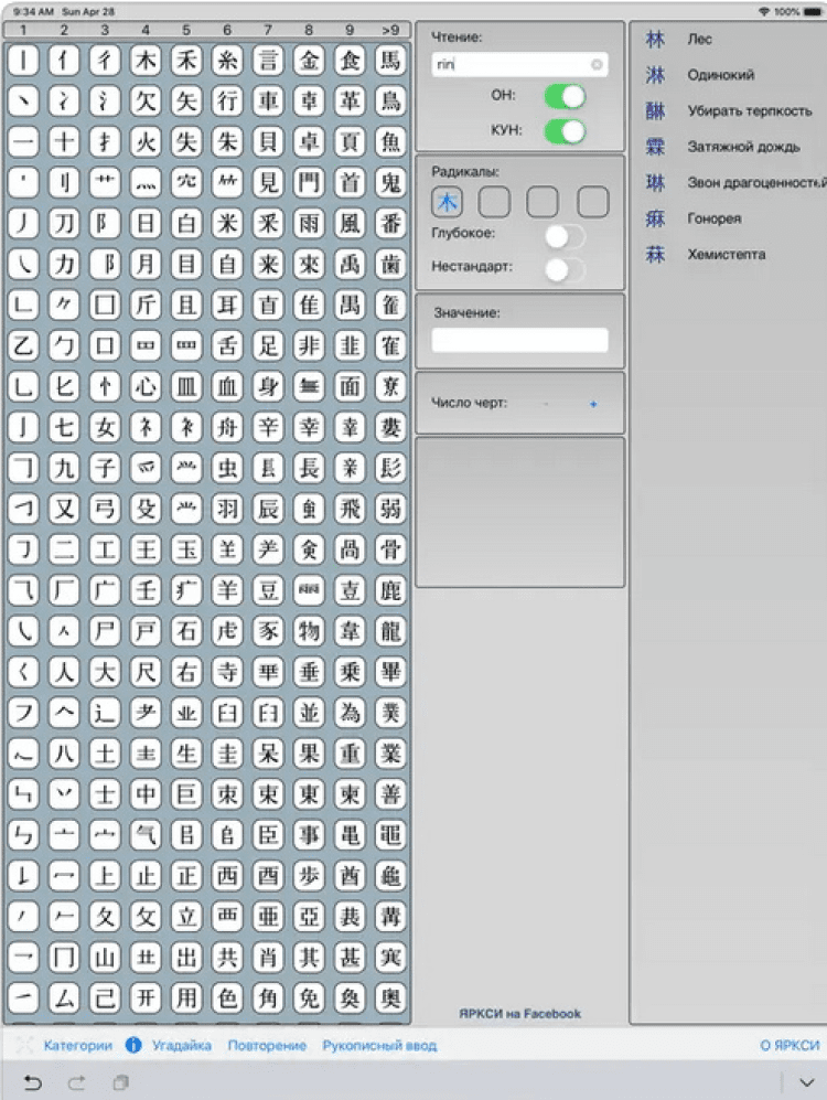 Программа ЯРКСИ Минимум поможет найти и запомнить японские иероглифы быстрее, благодаря использованию оригинальной системе разбивки кандзи на радикалы. Чтобы выполнить поиск того или иного иероглифа, вы можете начертить его на экране своего устройства, выбрать до 4 его элементов в списке, выбрать количество черт в нем, либо использовать писк по значению или чтению.