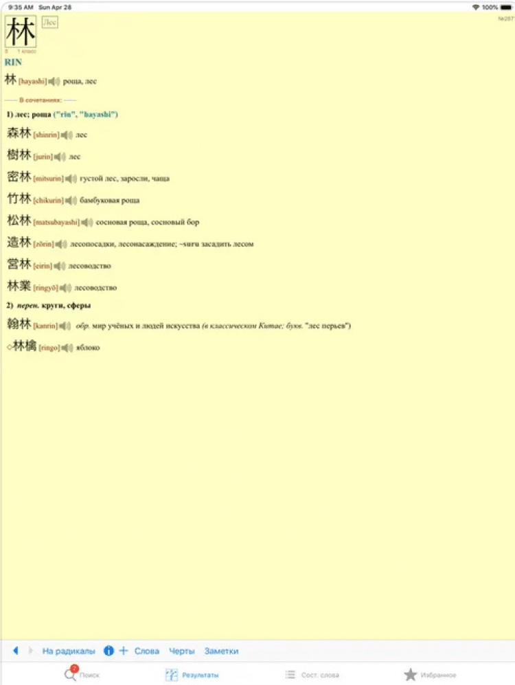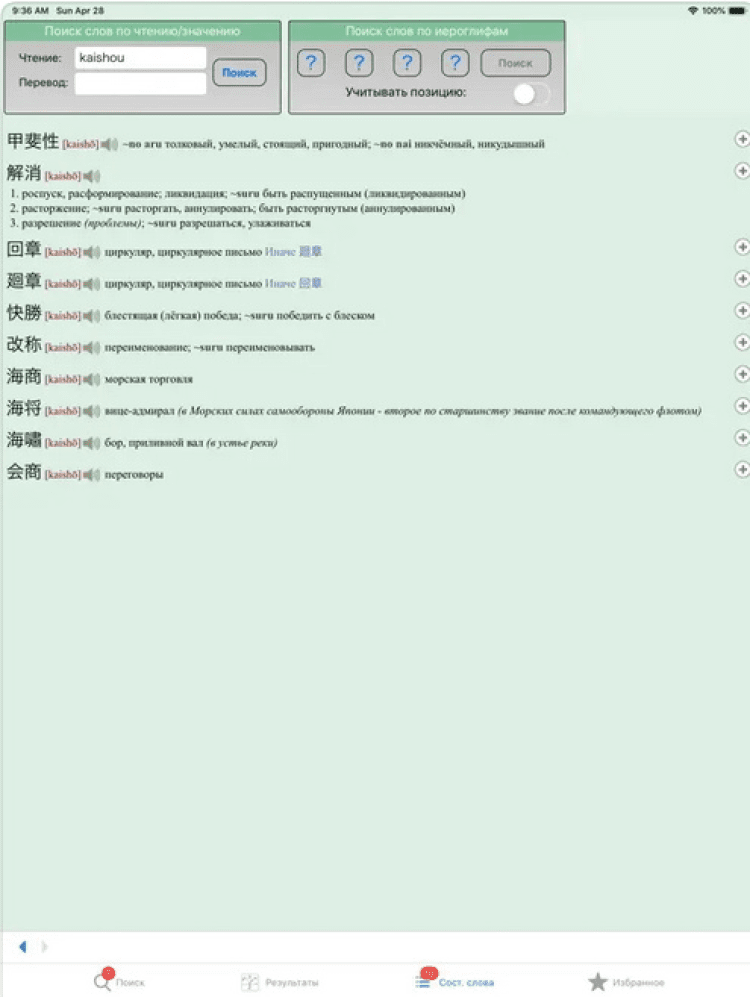 Помимо этого, программа ЯРКСИ Минимум для iOS позволяет выполнять поиск составных слов. В ней доступен поиск по иероглифам, с возможностью указания до 4 кандзи, по чтению, по значению, а так же специальный поиск, объединенный с иероглифами.