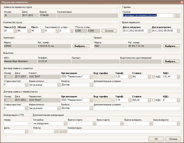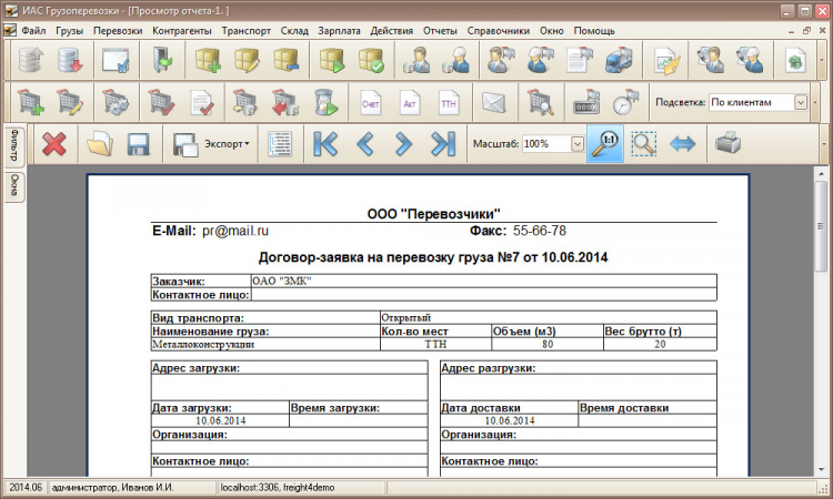 - печать отчетов по перевозкам, оплате и долгам;