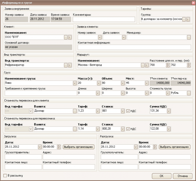 - обработка информации по заявкам на перевозку грузов;
