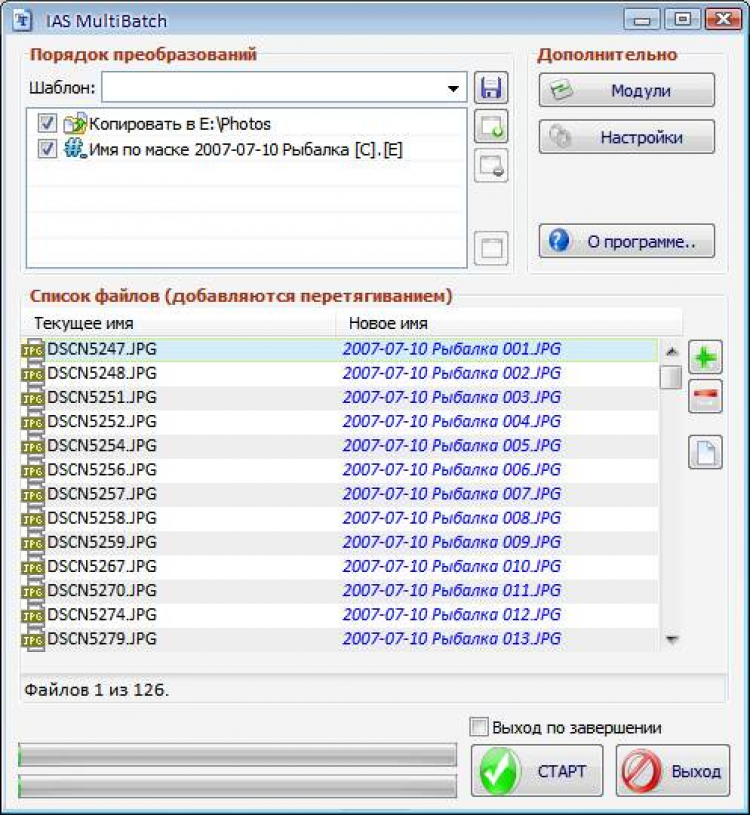 IAS MultiBatch - это программа, которая предназначена для произведения произвольного набора действий над большим количеством файлов. Она построена на модульной системе, что открывает неограниченные возможности для ее функциональности. В зависимости от установленных модулей программа может являться как простым переименователем файлов, так и конвертером изображений или преобразователем музыкальных файлов.