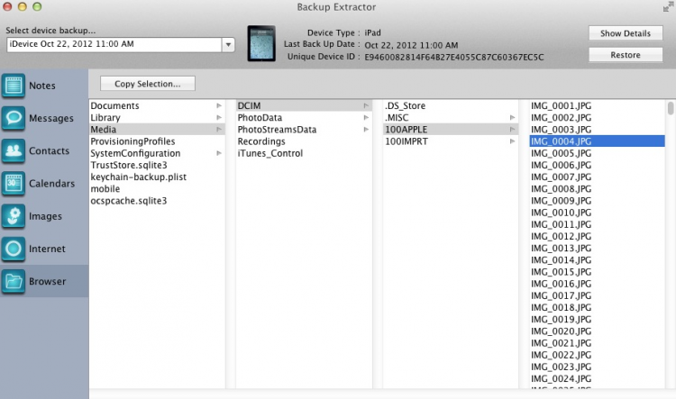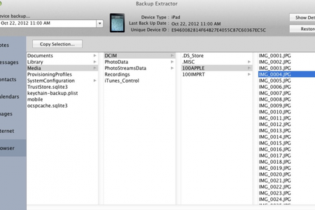 iBackup Extractor Программа для извлечения отдельных файлов из резервных копий, созданных с помощью iTunes. iBackup Extractor автоматически находить все доступные файлы бэкапов и позволяет извлекать из них журналы звонков, сообщения, контакты, фотографии, записи календаря, историю посещения веб-страниц, заметки, файлы приложений и т.д.