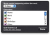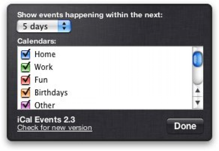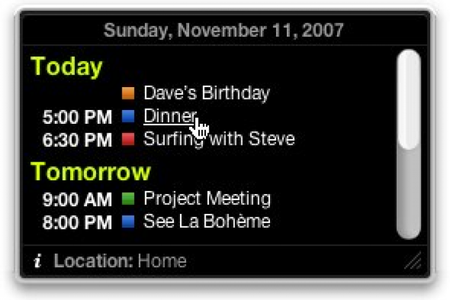 iCal Events Этот маленький виджет покажет вам все ваши намеченные дела, созданные в iCal, избавив вас от необходимости держать программу постоянно открытой. В настройках можно выбрать на сколько дней вперед показывать дела. Рядом с каждым событием отображается время и цвет категории.