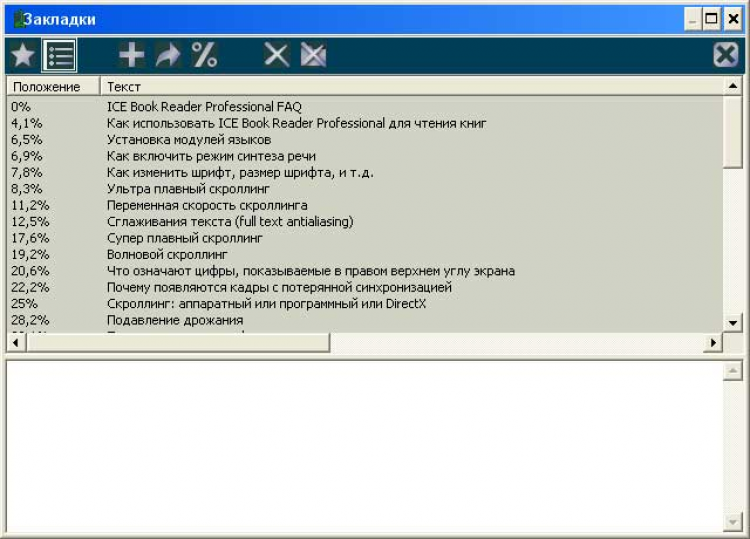 Функциональная программа для чтения электронных книг. Умеет все, что должна уметь читалка электронных книг. Понимает TXT, RTF, HTML, ePub, MS Word, PALM books (.PDB и .PRC), PSION books (.TCR), книги Microsoft Reader (.LIT), Microsoft HELP файлы (.CHM) и FictionBook файлы (все версии) (.FB2, .XML), а также умеет читать файлы прямо из архивов (zip, rar, arj, lzh, ha). Ультра плавный скроллинг с точным контролем скорости скроллинга, автоматически настраиваемая скорость скроллинга, full text antialising, супер скроллинг с субпиксельной точностью, волновой скроллинг, книжный режим с поддержкой скинов, полная поддержка Unicode и всех известных кодировок, автоматическое распознавание русских кодировок, автоматическое переформатирование текста, система искусственного интеллекта распознающая формат текста, автоматическое раскрашивание текста, встроенные в код программы архиваторы ZIP, RAR, ARJ, LZH, HA - это лишь малый список возможностей. Также умеет создавать MP3 книги и делает это очень быстро.
