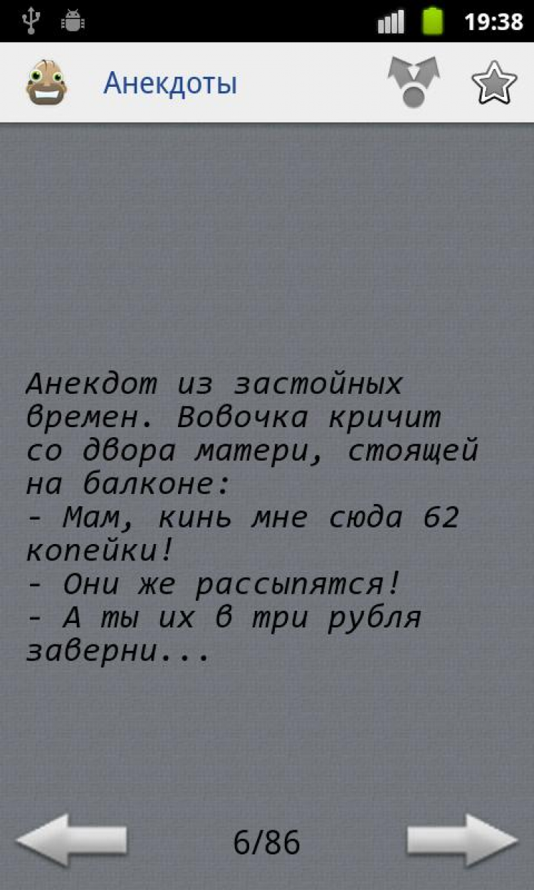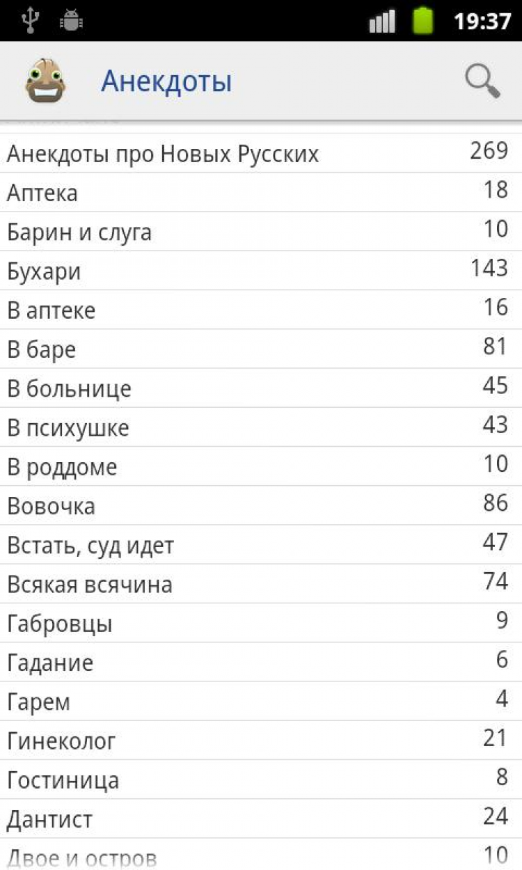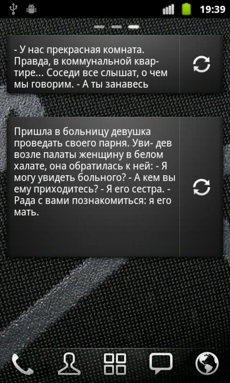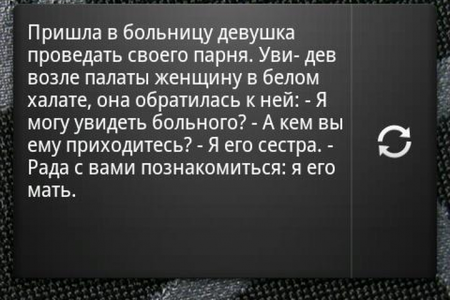 Великолепная коллекция анекдотов для вашего мобильного устройства. Множество категорий. Наслаждайтесь любимыми анекдотами где бы-то ни было, в поезде, метро, самолете. Добавляйте в избранное и расскажите потом друзьям, либо отправьте анекдот, программа использует стандартные клиенты Facebook, Twitter, Vkontakte. А великолепный виджет подарит настроение каждый раз, как только Вы включите телефон.