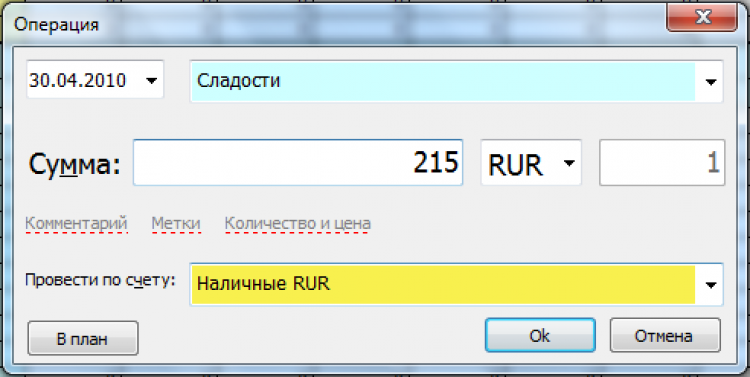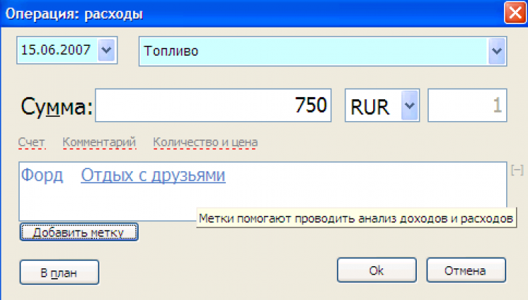 Пример объединения учета с помощью меток: При подготовке к новому году были куплены продукты, подарки, украшения на елку. Хотелось бы увидеть общую сумму, сколько было потрачено всего на подготовку к новому году. Для этого нужно каждой операции расходов к новому году (покупке продуктов, покупке подарков, покупке украшений) присвоить одинаковую метку "Новый год". В "Аналитике" появится метка "Новый год" и можно будет увидеть общую сумму всех расходов с этой меткой. Соглашение по использованию программы доступно на сайте программы. Эксплуатация программы признается акцептом действующего соглашения.