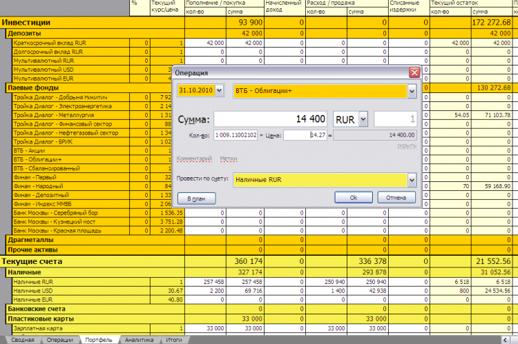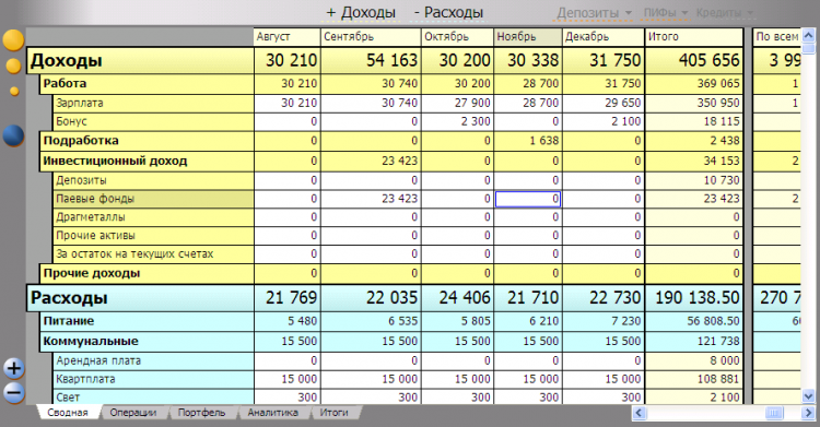 Краткая инструкция: После запуска программы пользователю открывается Сводная — закладка, на которой отображаются суммарные данные по всем зафиксированным операциям. Сводная также является основным инструментом для ввода операций: После запуска программы пользователю открывается "Сводная" — закладка, на которой отображаются суммарные данные по всем зафиксированным операциям. Сводная также является основным инструментом для ввода операций. Редактировать сохраненные операции можно на закладке “Операции”, управление инвестиционными инструментами доступно на закладке Портфель.