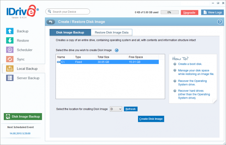 Еще одна функция IDrive Online Backup, которую стоит отметить, это создание и восстановление образа жесткого диска. С ее помощью можно, например, сделать образ системного диска/раздела, и восстановить его в случае проблем с ОС.