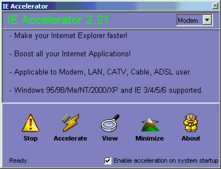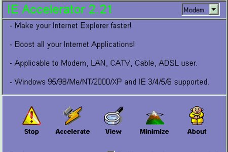 IE Accelerator - это небольшое приложение, которое позволяет пользователю увеличить просмотр и скачать скорость Internet Explorer корпорации Майкрософт. В отличие от других приложений такого рода это программное обеспечение не изменить различные разделы реестра, он фактически изменяет количество одновременных подключений, которые могут иметь каждое окно браузера.