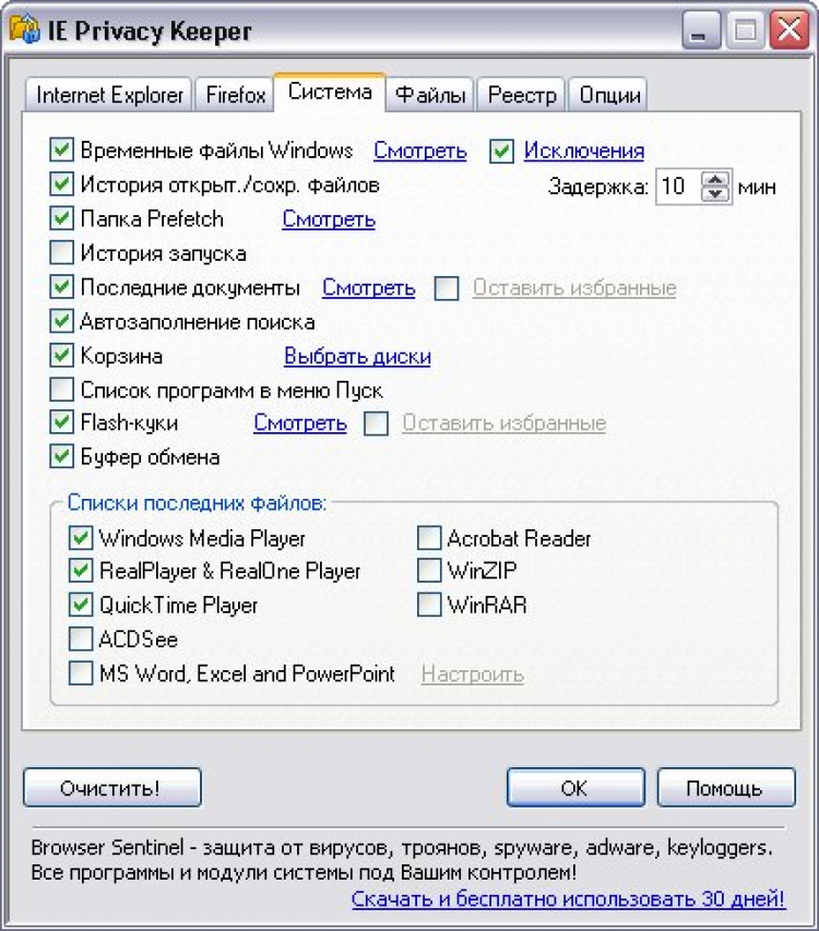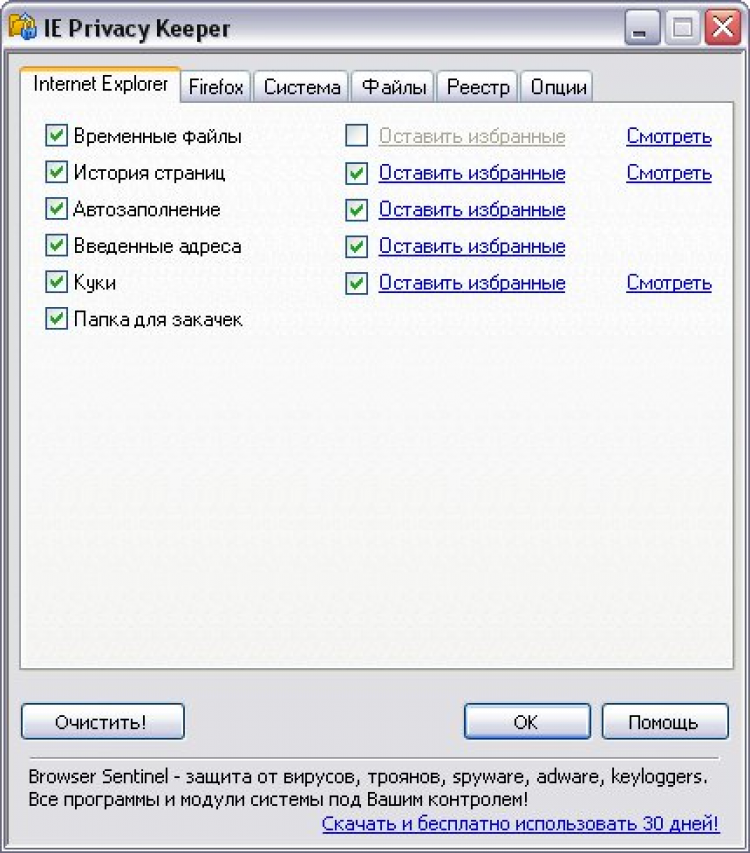 Программа также очищает Вашу оффлайн-активносить (недавние документы, списки открытых/сохраненных файлов и т.д.). Программа позволяет оставить избранные элементы истории, чтобы скрыть факт очистки. IE Privacy Keeper содержит функции для надежного удаления файлов, чтобы предотвратить их восстановление. Вы можете указывать дополнительные папки и ключи реестра для очистки.