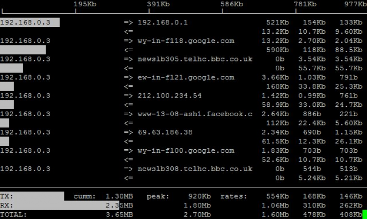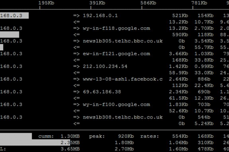 iftop-linux Консольная утилита, которая мониторит сетевые соединения и отображает таблицу в реальном времени - в какими хостами какая скорость обмена данными используется. Поможет быстро и с высокой точностью определить, из-за чего забит весь канал и что является причиной низкой скорости соединения с Интернетом.