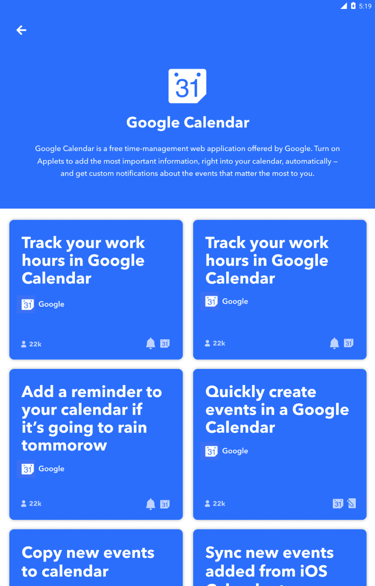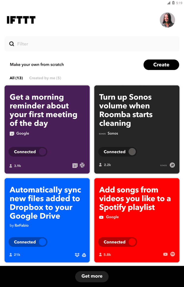 IFTTT — бесплатное приложение, при помощи которого вы можете задать условия для автоматического выполнения различных действий на вашем мобильном телефоне или планшете. К примеру, приложение поможет получить актуальный прогноз погоды с утра, задать действия, которые будут произведены основываясь на вашем местоположении, либо в назначенное время. Возможны сотни различных сценариев, управлять которыми можно при помощи удобных апплетов, входящих в состав приложения.