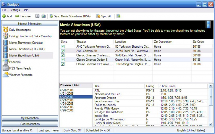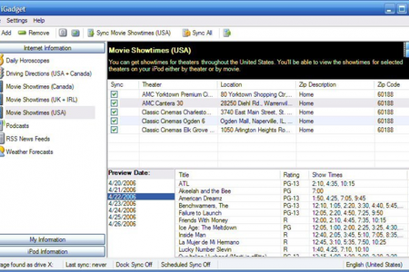 С помощью iGadget вы сможете перенести музыку со своего плеера или телефона на компьютер, сохранив при этом счетчик проигрываний, рейтинг, дату последнего воспроизведения и и даже позицию трека, на которой вы закончили прослушивание. Программа также позволяет переносить метаданные треков с вашего iPod прямо в медиатеку iTunes. Помимо этого, iGadget может копировать на мобильное устройство различную полезную информацию, включая расписание кинотеатров, ежедневный гороскоп, новостные ленты, списки треков, библиотеку и т.д.