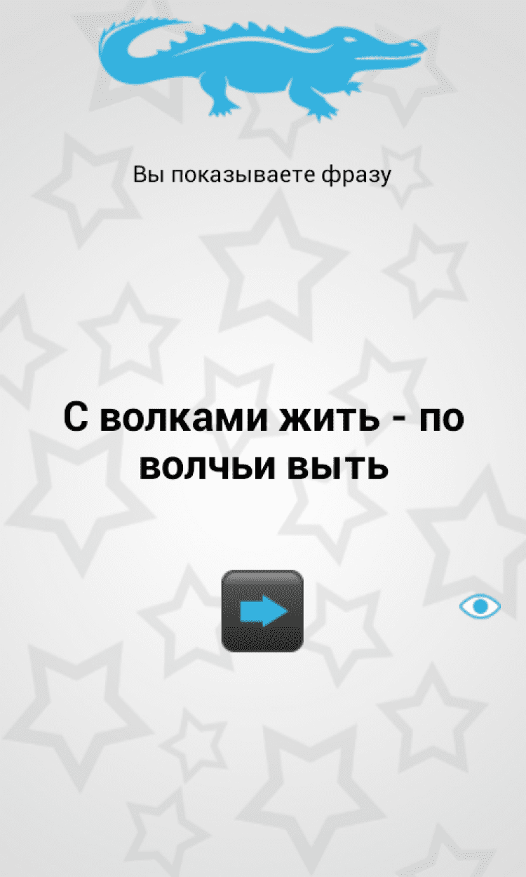- С нашим приложением играть в "Крокодила" стало еще интереснее. В "Бомбе Вечеринок" есть база фраз и слов для игры "Крокодил". Вы просто передаете ваш телефон следующему игроку, и тот получает свое задание. Теперь игроку придется проявить все свои артистические способности, чтобы показать задание, не произнеся ни слова!