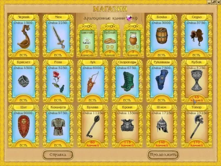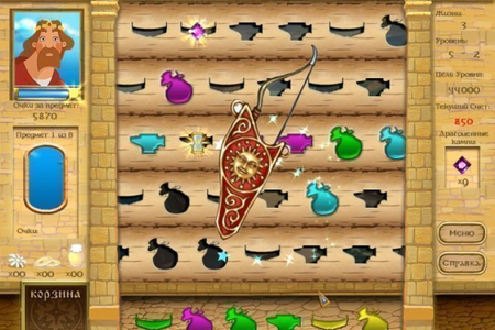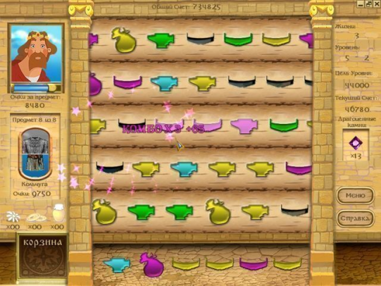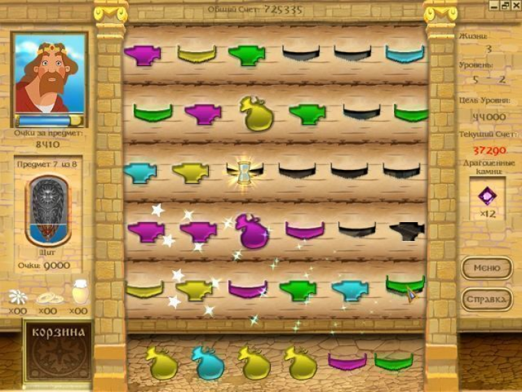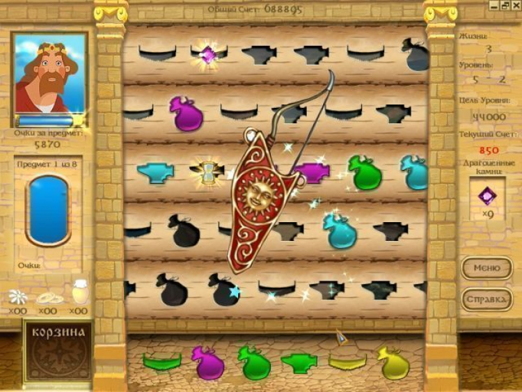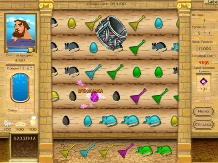 Чтобы восстановить ее, используйте особые снадобья, которые можно приобрести в специальном магазине. Также вы можете увеличить количество получаемых баллов, если будете устанавливать в ряд несколько волшебных предметов одного цвета. Чем длиннее получится такая цепочка тем больше очков вы заработаете. Время от времени на игровом поле появляются драгоценные самоцветы. Собирайте их, чтобы получить взамен магические доспехи и другие полезные вещи, которые обязательно пригодятся Илье Муромцу в ходе его путешествия.