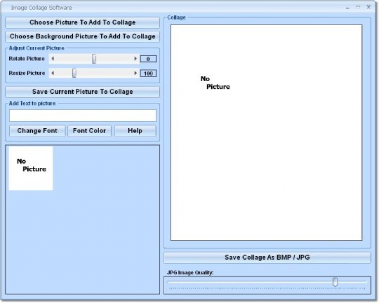 Image Collage Software - это программа для создания коллажей из цифровых изображений или фотографий. Используя сдайдеры, пользователь может поворачивать изображения и изменять их размер. Так же на каждое изображение можно накладывать свой текст. Готовый результат может быть сохранен в формате BMP или JPG.