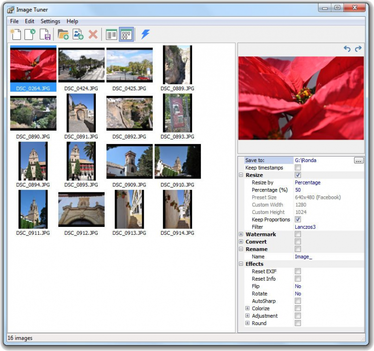 Кроме этого Image Tuner умеет переименовывать, поворачивать, сжимать изображения, и добавлять визуальные эффекты. Есть также функция добавления водяного знака.