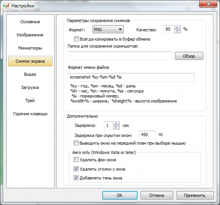 - Захват всего экрана или активного окна, или выбранной с помощью мыши области экрана (кнопка «Quick Shot»).