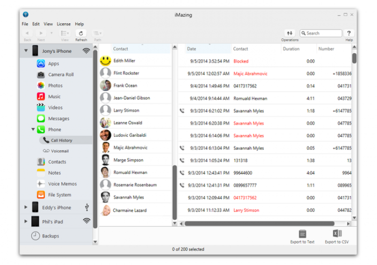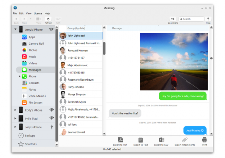 Хотите сохранить историю переписки с человеком? Программа позволяет сохранить, экспортировать (в PDF, CSV или TXT) и даже распечатать SMS, MMS сообщения, а также сообщения из iMessages. Помимо самих сообщений также сохраняются и прикрепленные файлы. Сохраненные сообщения вы сможете просматривать на компьютере или перенести на новый телефон.