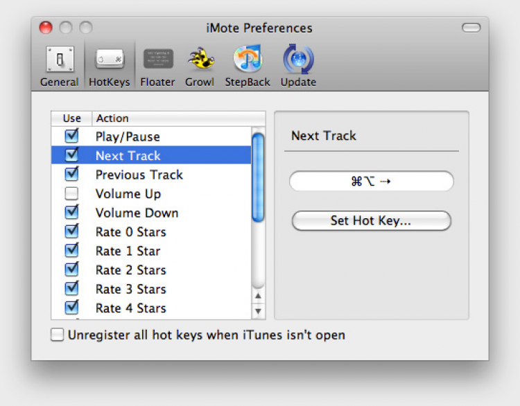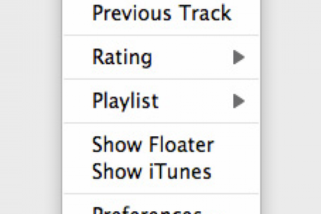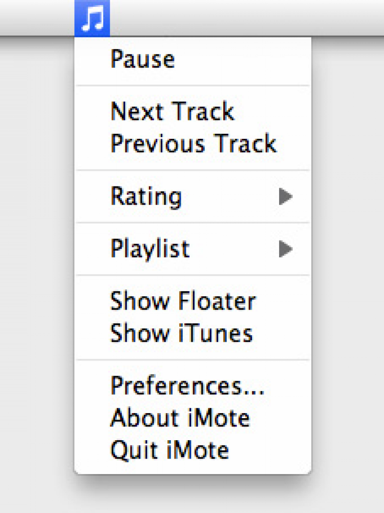 iMote Небольшое удобное приложение для управления воспроизведением музыки в iTunes непосредственно из строки меню. iMote позволяет пользователям приостанавливать воспроизведение, менять трек, выбирать плейлисты, регулировать громкость, выставлять рейтинги и многое другое. iMote содержит небольшое плавающее окошко, в котором отображается информация о проигрываемой композиции, включая обложку, рейтинг, название альбома и композиции, исполнителя.
