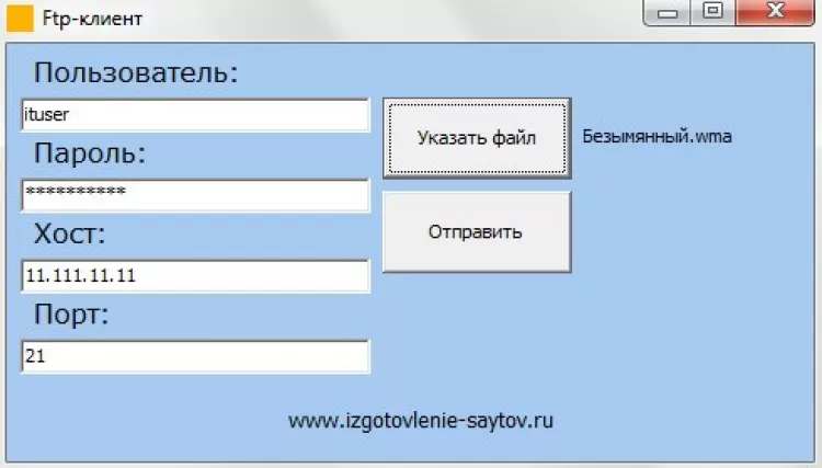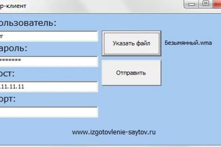 Программа представляет собой 4 поля ввода данных: пользователь, пароль, хост и порт, и две кнопки: указать файл и отправить. Указывать данные своего ftp постоянно не нужно, программа их запомнит, и будет вводить автоматически. Также в программе есть указатель на выбранный файл, а также небольшой обработчик ошибок, который будет информировать Вас о результатах процесса передачи. Архив программы перед началом работы желательно распаковать.
