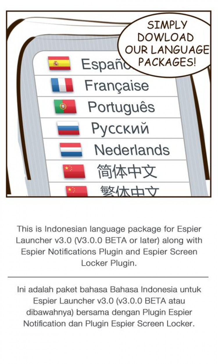 Indonesia-ID for Espier Apps Дополнение для приложения Espier Launcher версии 3.0.0 и выше, добавляющее индонезийский язык. Теперь вы сможете использовать любимое приложение на удобном для вас языке.