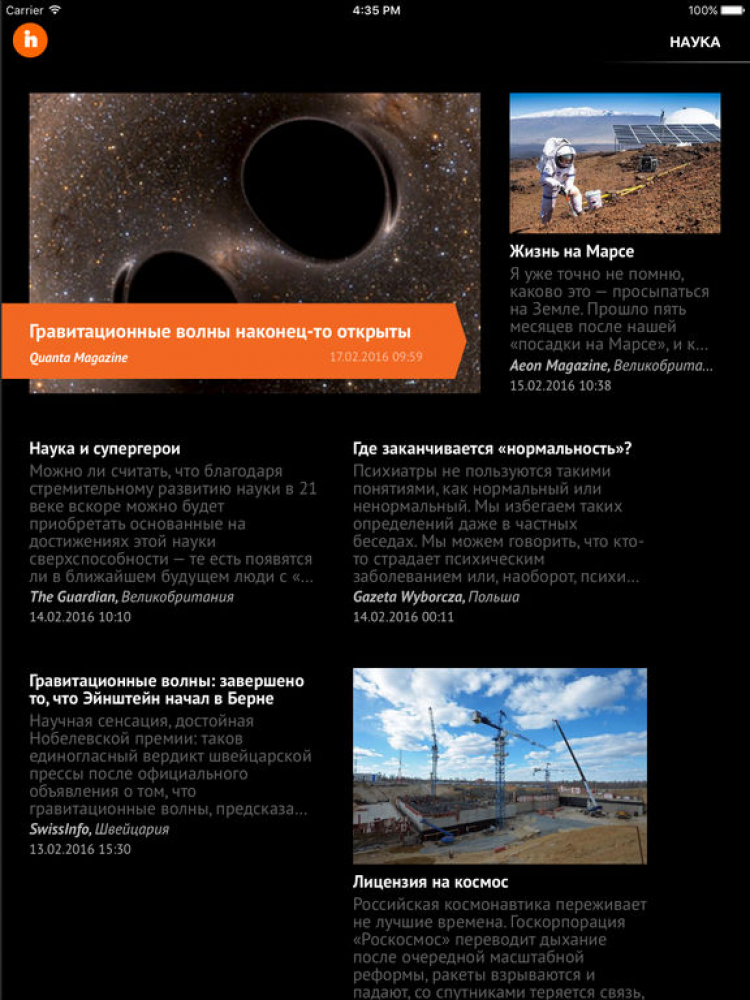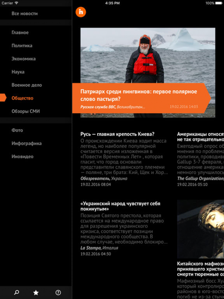 ИноСМИ Это приложение позволит вам читать статьи, аналитические материалы, обзоры зарубежной прессы и просматривать смотреть фотоленты и видеосюжеты, прямо на экране вашего мобильного устройства. Приложение ИноСМИ обладает удобной и гибкой системой поиска, которая позволит найти любую статью по региону, стране, языку, либо названию издания. Все текстовые материалы разделены на категории "Россия", "Мир", "СНГ и Балтия" и "Спорт". Приятной особенностью приложения является возможность делиться статьями, видео и фотографиями с друзьями, при помощи Twitter, Facebook, электронной почты и SMS.