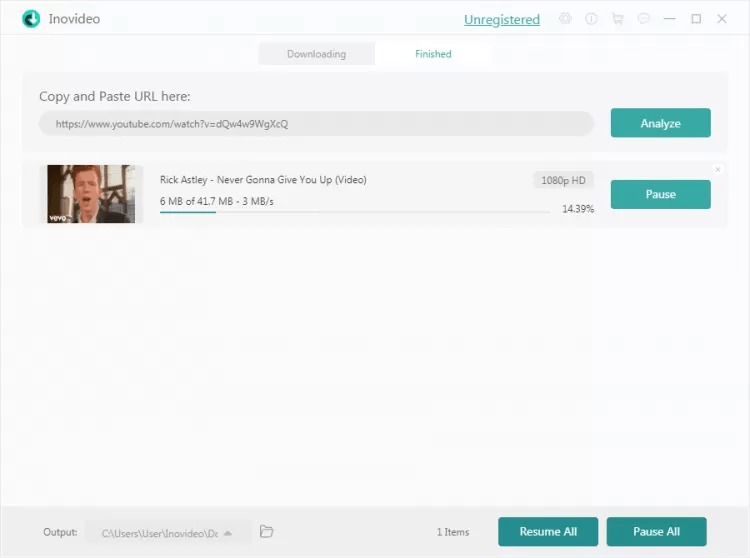 Независимо от выбранной источника, для скачивания видео нужна только ссылка на страницу с видео. Вставьте ее в специально предназначенное для этого поле и Inovideo проанализирует ее. После анализа она определит доступные форматы и уровни качества, в которых можно скачать видео.