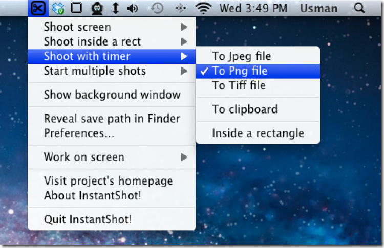 InstantShot! Удобная утилита для создания скриншотов. InstantShot! позволяет создавать скриншоты целого рабочего стола, выделенной области или отдельного окна. При этом делать скриншот можно вручную, или по таймеру. Поддерживаются форматы JPG, PNG и TIFF.
