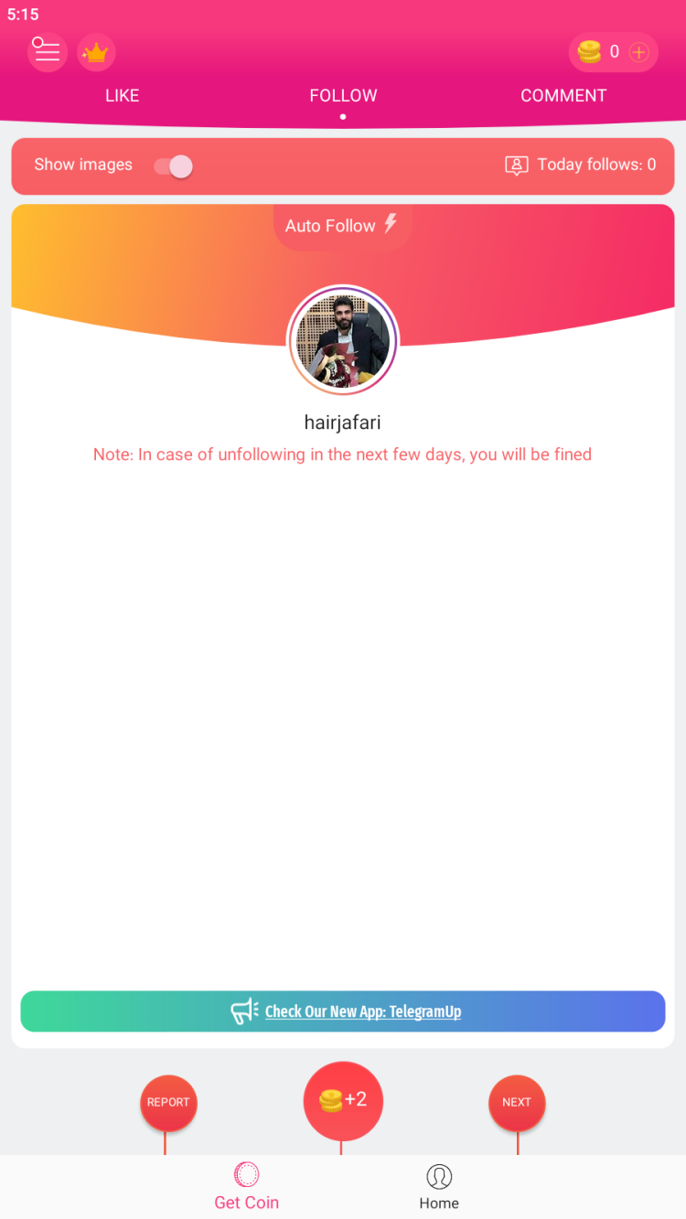 Интересно, что в последней версии InstaUp вы можете делать заказы, не тратя ни копейки. Открыв приложение, прямо на главном экране вы увидите страницы других пользователей. Подписывайтесь на них, чтобы бесплатно зарабатывать монеты в приложении. Также в верхней части экрана вы можете увидеть функцию «auto follow», которая помогает зарабатывать монеты автоматически. Но имейте в виду, что вам не разрешается отписываться от этих профилей в течение пары дней, иначе вы получите штраф в приложении.