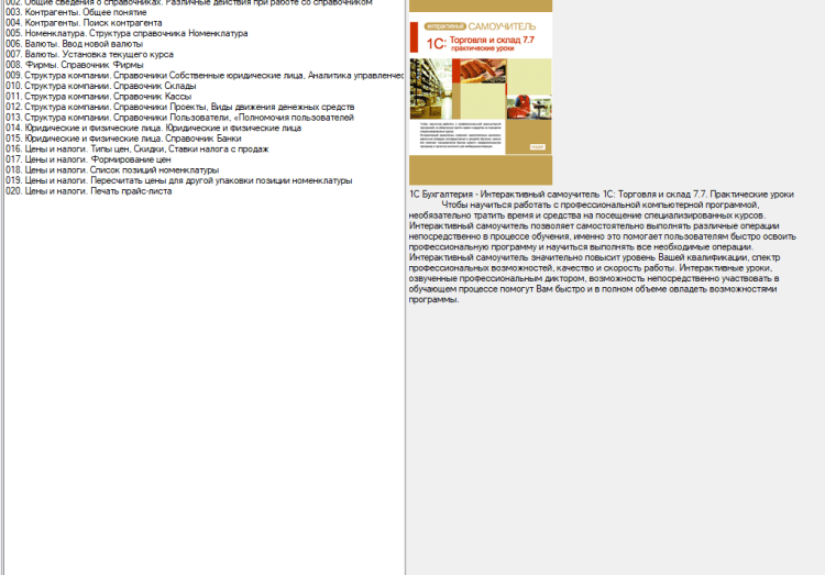 Интерактивный самоучитель 1С: Торговля и склад. Практические уроки - это программа поможет научиться работать с профессиональной компьютерной программой, необязательно тратить время и средства на посещение специализированных курсов. Интерактивный самоучитель позволяет самостоятельно выполнять различные операции непосредственно в процессе обучения, именно это помогает пользователям быстро освоить профессиональную программу и научиться выполнять все необходимые операции.