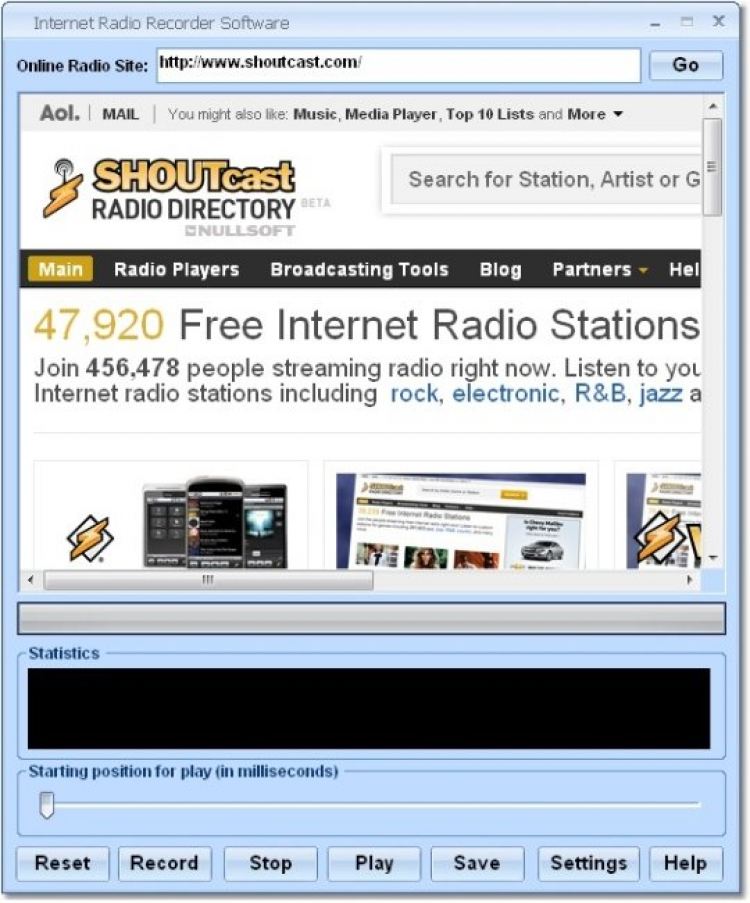 Internet Radio Recorder Software — программа для захвата и записи эфира интернет радиостанций. В программе уже содержится список некоторых станций, который пользователь может пополнять самостоятельно. В настройках программы можно выбрать частоту дискретизации, канал и разрешение аудио записи.