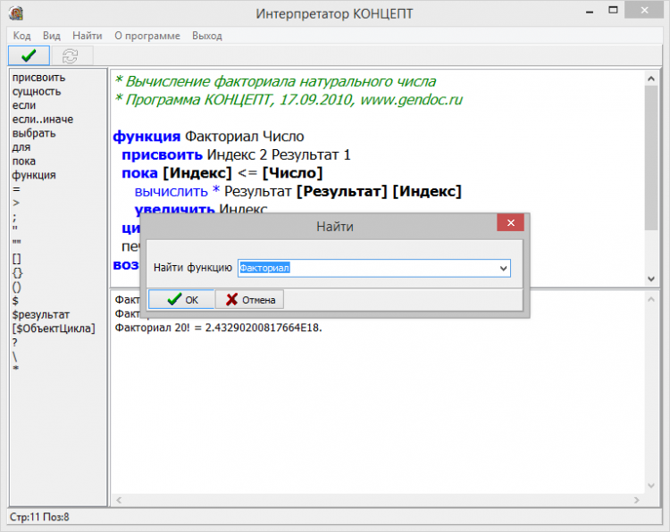 Одно из главных преимуществ интерпретатора КОНЦЕПТ - простота в работе в сочетании с большим количеством команд для работы со строками, списками, множествами и т.д. Кроме этого, он включает в себя средства для выполнения символьных вычислений и встроенные механизмы сопоставления списков, строк и фактов по столбцу. В интерпретатор КОНЦЕПТ входит база фактов, которая позволяет работать с семантическими сетями, фреймами, объектами, графами и другими моделями данных на высоком уровне. Cкачайте интерпретатор КОНЦЕПТ с FreeSoft.ru. Это бесплатно, безопасно и быстро!
