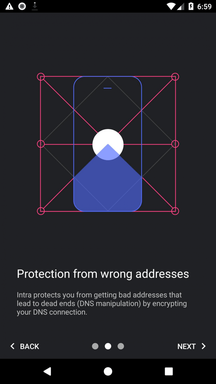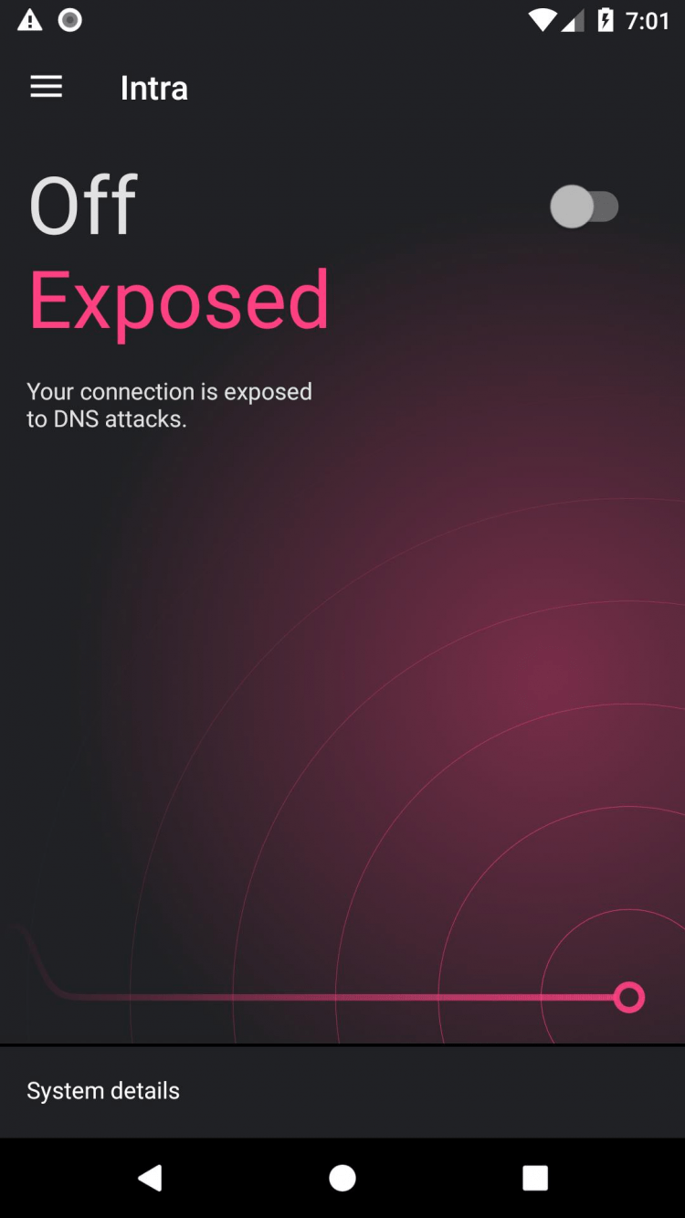 Intra — это бесплатное приложение Intra для Android защитить ваш смарфтон от злоумышленных дейсвий, связанных с манипуляцией с DNS, которые часто используют для ограничения доступа к новостным сайтам, соцсетям и мессенджерам.