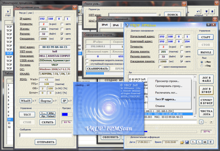 Включает в себя сканер сети (подсети), задаваемого диапазона, с целью выявления доступных рабочих IP-адресов (узлов) с быстрым определением их MAC-адресов, позволяет провести тестирование выбранного узла по известному IP-адресу, определить IP-адрес по известному MAC-адресу или NET-имени, вывести подробную информацию о ресурсах узла и некоторую другую дополнительную информацию, позволяет следить за соединениями и трафиком локального узла, проверить открытые порты выбранного узла.