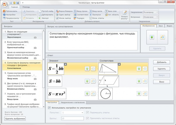 Вы можете создавать тесты, используя 23 типа вопросов. Вставка в тест аудио, видео и формул — прекрасный способ точнее поставить вопрос или просто разнообразить тест. iSpring QuizMaker позволяет создавать математические тесты и опросы с графиками, формулами и изображениями. Программа iSpring QuizMaker позволяет настраивать сообщения для показа пользователю в зависимости от ответа на вопрос: верно, неверно или частично верно.