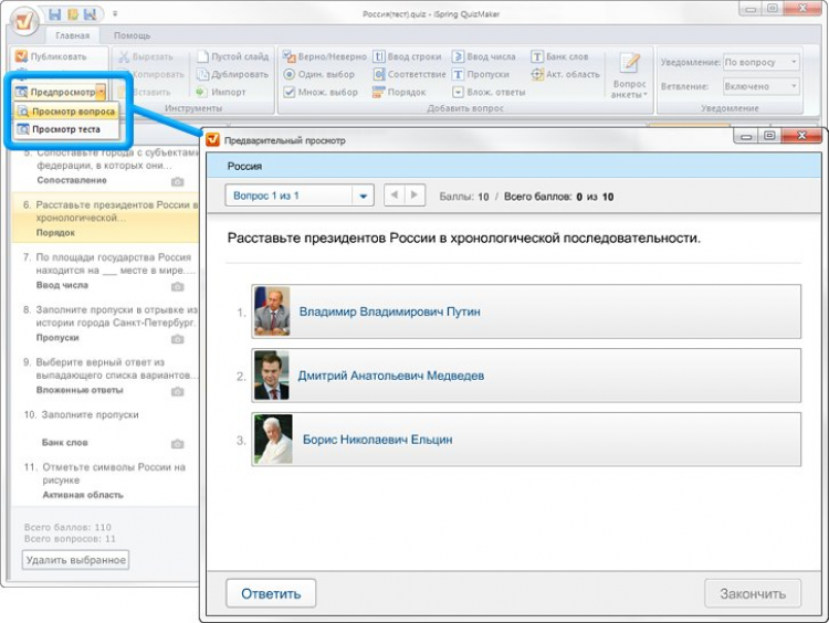 iSpring QuizMaker - это программа для создания тестов, функциональная и одновременно простая в использовании. Тест представляет собой один Flash-файл, готовый для публикации в СДО. Легко и быстро создавайте интерактивные тесты для контроля знаний учащихся и проведения профессиональной аттестации сотрудников. Программа iSpring QuizMaker позволяет создавать как тесты, подразумевающие обязательную оценку результата, так и опросы, идеальные для сбора информации и проведения исследований.