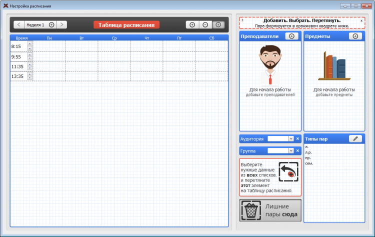 Для начала работы с iStodo необходимо составить список всех предметов и преподавателей. После этого, используя визуальный редактор расписания, можно легко и быстро, простым перетаскиванием, добавлять предметы в таблицу. В программе можно составлять расписание на четные/нечетные недели.