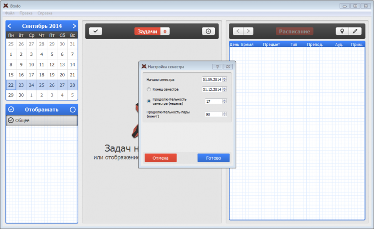 iStodo - это полезная программа, созданная специально для студентов, с помощью которой можно составить расписание занятий и распланировать процесс обучения на целый семестр. Она обладает удобным визуальным редактором, который позволяет быстро корректировать и составлять расписание пар.