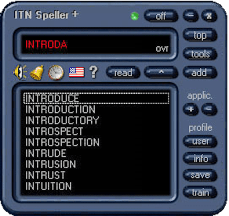 ITN Speller Plus — это контроль правописания, преобразование текста в речь, а также многофункциональный напоминатель событий. ITN Speller Plus способна проверять правописание при работе в любом приложении Windows, накапливать статистику о характерных ошибках. Обеспечивает режим тренинга и озвучивание печатаемого текста. Может использоваться людьми с ослабленным зрением, или слепыми. Оснащена функциями программируемого напоминателя для неограниченного числа событий и интервалов времени.