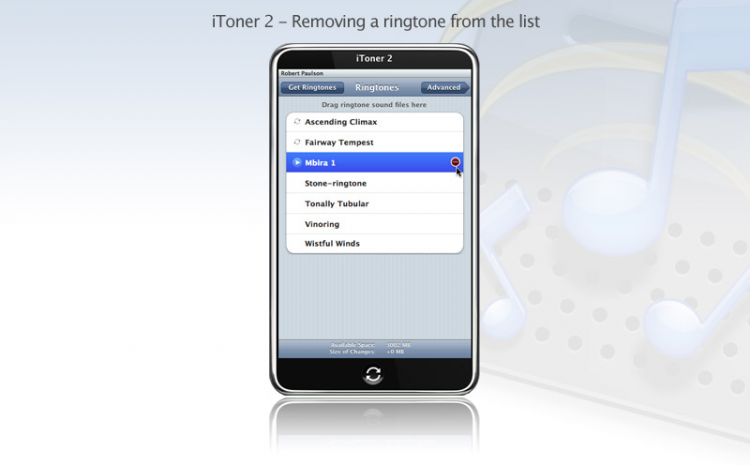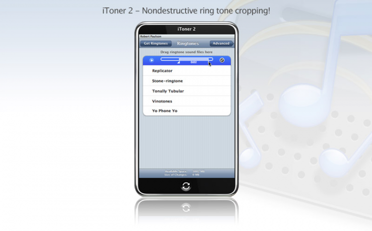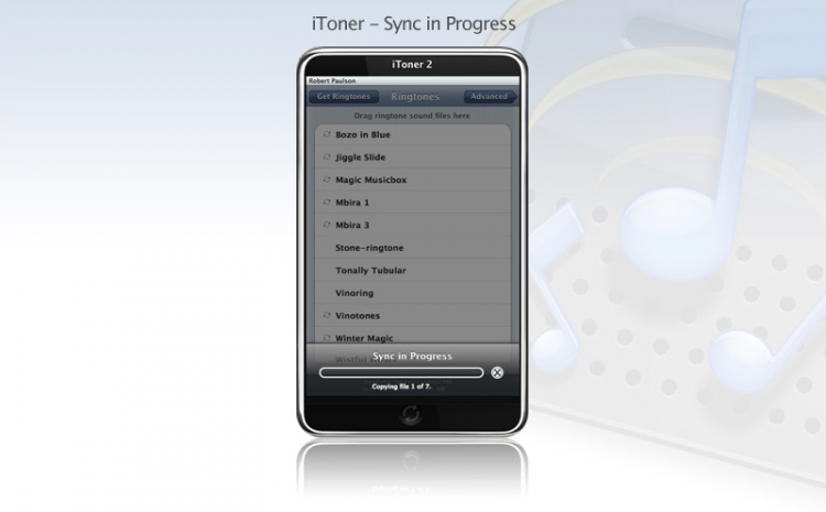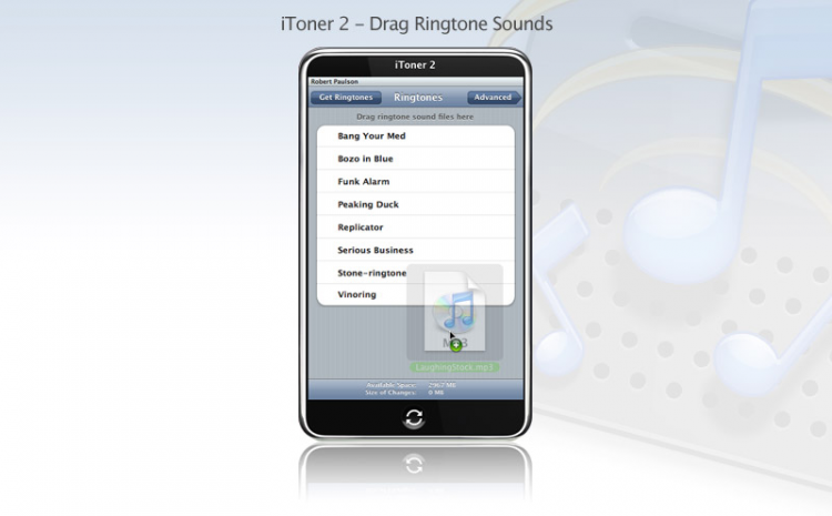 iToner Программка для передачи рингтонов на iPhone. Просто перетащите MP3 или AAC файл(ы) в окно программы и нажмите кнопку Sync. Готово!. И никакого влома, перезагрузки и прочих неудобств.