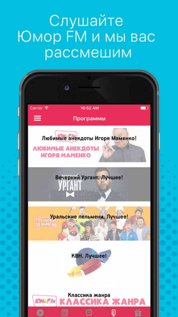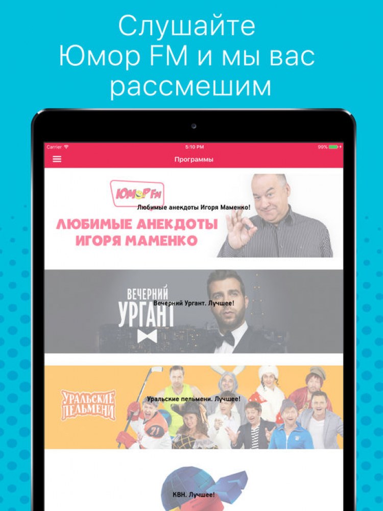 Юмор FM это первая и единственная на сегодняшний день радиостанция России, основу формата которой составляет юмор всех жанров и направлений, от классики эстрадного жанра до самых модных комедийных направлений, и музыкальные супер-хиты десятилетия.