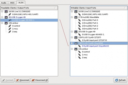 Предположим, нам нужно записать многоканальную композицию с вокалом и синтезатором в качестве инструментов. У нас есть MIDI-клавиатура, программный (виртуальный) синтезатор на компьютере, а также микрофон, подключённый ко входу звуковой карты. По каким-то причинам мы хотим записать обе дорожки одновременно. Тогда, с помощью JACK, мы можем подключить: